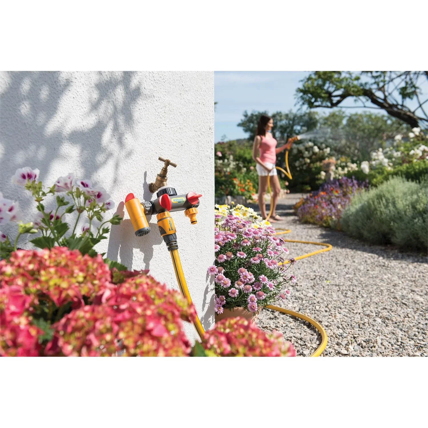 The 3-way tap connector allows you to connect two watering devices or hose pipes directly to one outside tap and has a third, permanently accessible outlet that rotates to allow water to be directed into a bucket or watering can.