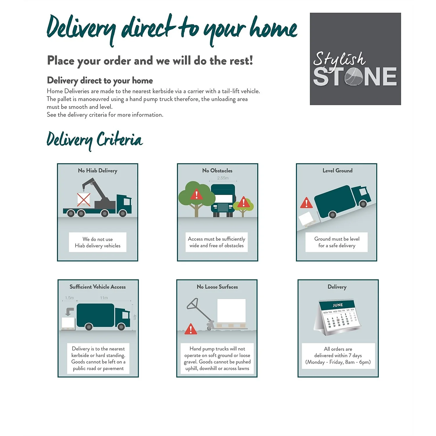 | Additional Information | Please ensure you meet the delivery criteria for this product prior to ordering. Home deliveries are made to the nearest kerbside or hard standing via a carrier with a tail-lift vehicle. The pallet is manoeuvred using a hand pump truck therefore the unloading area must be smooth and level. See the full delivery criteria in the product images. This product is made up of natural materials so exact colours will vary by batch. Dimensions are the approximate finished size when laid including joints. |