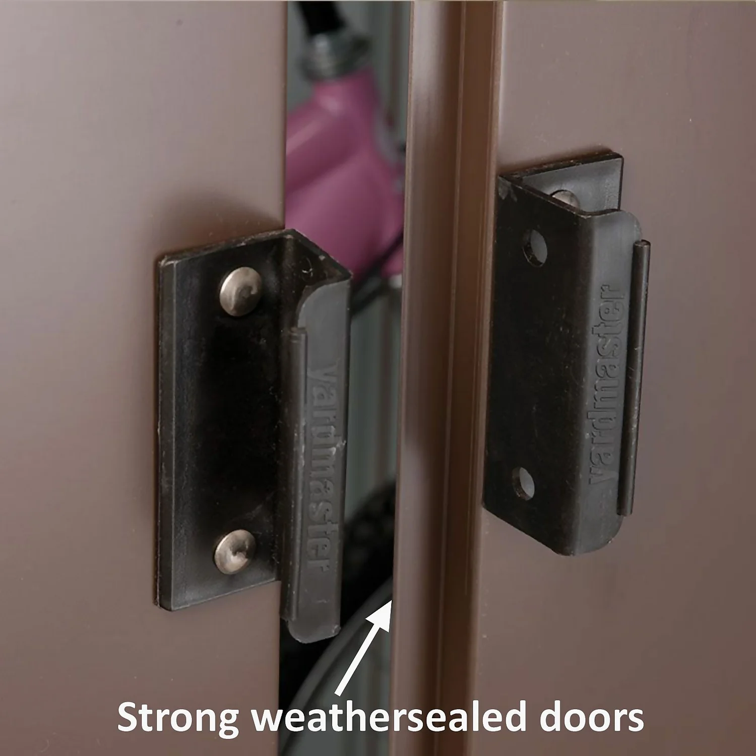 The Yardmaster Woodgrain metal shed 8ft x 6ft has double sliding doors and wood effect cladding which blends into garden settings